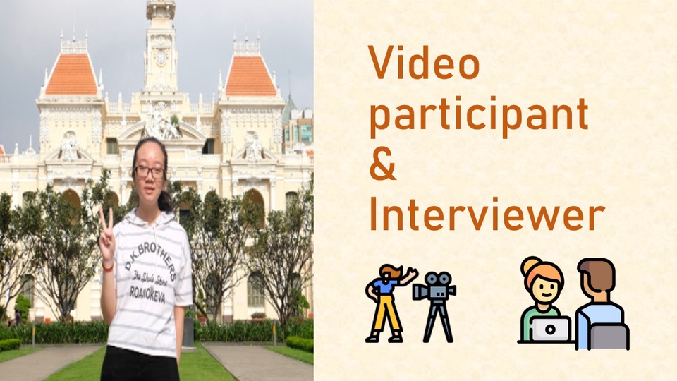 Em có thể tham gia quay video với tư cách người phỏng vấn hoặc được phỏng vấn, tham gia diễn vai phụ,...