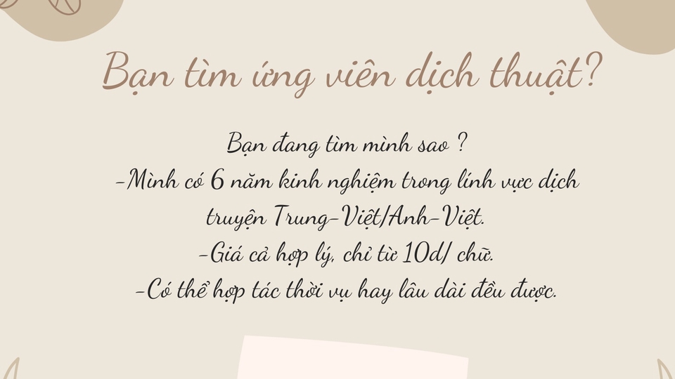 Sinh viên chuyên nghành Luật Thương Mại tại Đại học Luật Thành phố Hồ Chí Minh. 4 năm trong đội tuyển học sinh giỏi Văn. 6 năm kinh nghiệm dịch truyện Trung-Việt, Anh-Việt, edit truyện tranh cơ bản. 2 năm kinh nghiệm trong mảng CSKH-Telesale Bất động sản.