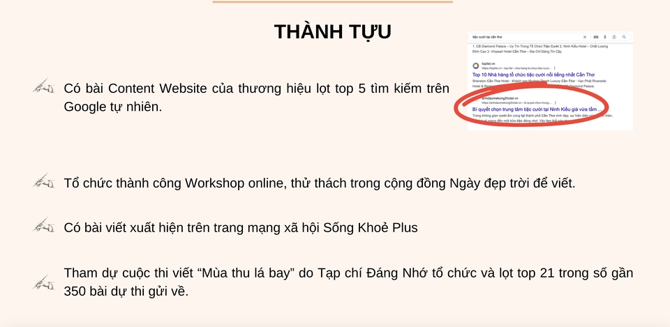 Mình có thể giúp SMEs xây dựng mạng lưới nội dung chất lượng trên Website và giữ chân khách hàng mục tiêu bằng những bài viết có chiều sâu với văn phong tự nhiên, mượt mà và cô đọng. Bên cạnh đó, mỗi bài viết đều được tối ưu SEO để tăng lượt truy cập thông qua việc hiển thị tìm kiếm trên Google. Hơn nữa, mình còn cung cấp dịch vụ xây dựng nội dung Website trọn gói từ lên kế hoạch, nghiên cứu từ khoá, viết bài và tối ưu Website với chi phí phù hợp cho các doanh nghiệp SME. Quy trình thực hiện dịch vụ 1. Nghiên cứu thương hiệu, khách hàng mục tiêu, giọng văn, thực trạng hiện có,... 2. Lập kế hoạch nội dung 3. Tiến hành xây dựng nội dung theo kế hoạch 4. Gửi kết quả và đợi phản hồi