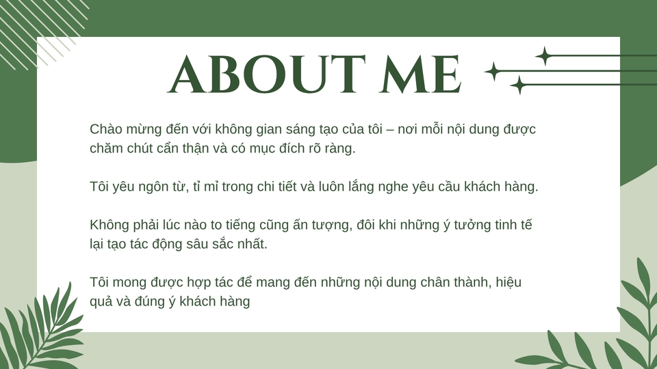 Tôi là người làm việc nhanh, rõ ràng và rất dễ hợp tác. Tôi tiếp thu yêu cầu tốt, chủ động hỏi – chủ động sửa và luôn cố gắng giao đúng như khách cần. Điểm mạnh của tôi là chăm chỉ, tỉ mỉ và hoàn thành công việc đúng thời gian.