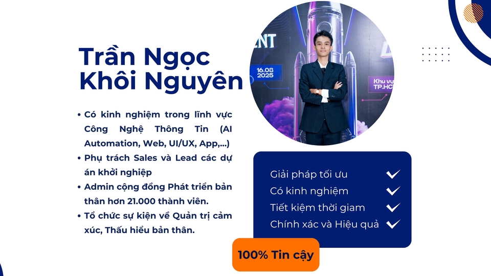 Freelancer trong lĩnh vực Công nghệ thông tin và Học máy, chuyên lập trình web và ứng dụng AI. Đạt huy chương trong các cuộc thi lập trình, có kinh nghiệm về kinh doanh và từng dẫn dắt nhiều dự án khởi nghiệp, đội nhóm thi đấu. Đồng thời là admin một cộng đồng phát triển bản thân hơn 21.000 người theo dõi, tổ chức sân chơi và workshop về tư duy, kỹ năng và quản trị cảm xúc.