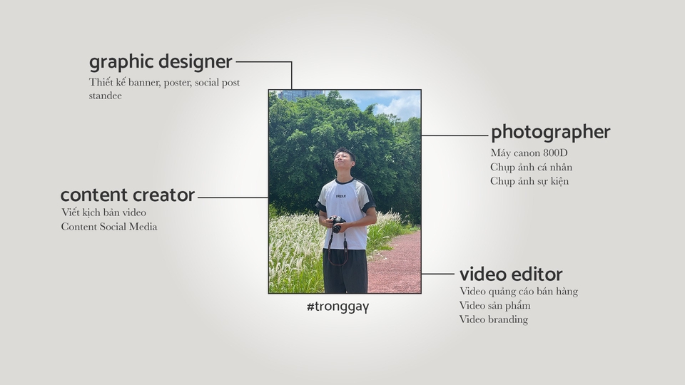 Mình hoạt động trong lĩnh vực truyền thông, marketing, các skill mình có thể làm đó là: quay phim, chụp ảnh, design, edit video