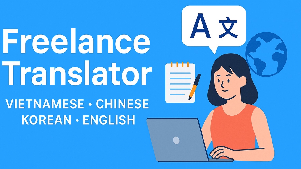 Tôi là freelancer đang học và trau dồi các ngôn ngữ Trung, Hàn và Anh. Tôi có thể dịch các nội dung cơ bản giữa bốn ngôn ngữ: Việt – Trung – Hàn – Anh. Tôi luôn cố gắng nâng cao kỹ năng, làm việc chăm chỉ và hoàn thành công việc đúng thời hạn.