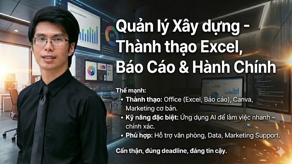 Tôi có 5 năm kinh nghiệm quản lý trong ngành xây dựng, chuyên xử lý Excel, nhập liệu, báo cáo và công việc hành chính. Thành thạo Office, Canva, có kiến thức marketing cơ bản và biết ứng dụng AI để làm việc nhanh & chính xác. Phù hợp với các công việc hỗ trợ văn phòng, data và marketing support.