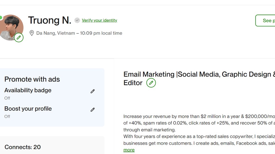 Email Marketing |Social Media, Graphic Design & Video Edito Dịch vụ tiếp thị email: - Soạn thảo và thiết lập email - Tạo chiến dịch email - Thiết kế mẫu email - Tự động hóa email - Thiết lập luồng email - Theo dõi và báo cáo Tôi đã sử dụng các công cụ như excel , word và powerpoint , photoshop .