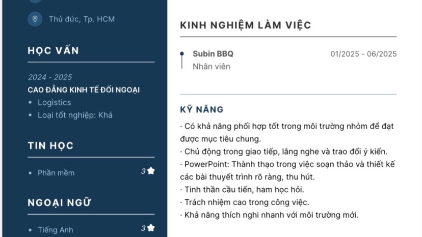 Là một người năng nổ trong công việc, mong muốn được làm để có thêm kinh nghiệm và thu nhập