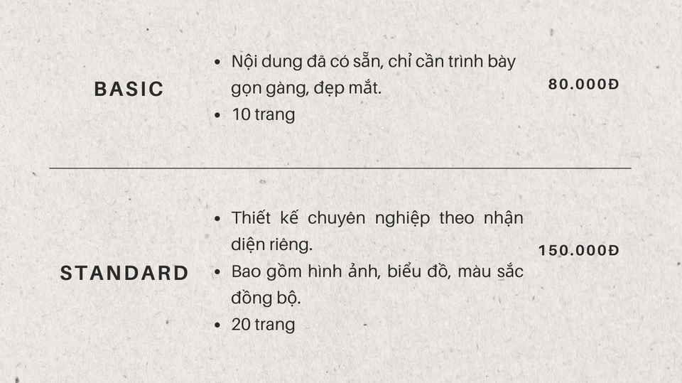 ₫150.000Thiết kế chuyên nghiệp theo nhận diện riêng. Bao gồm hình ảnh, biểu đồ, màu sắc đồng bộ.