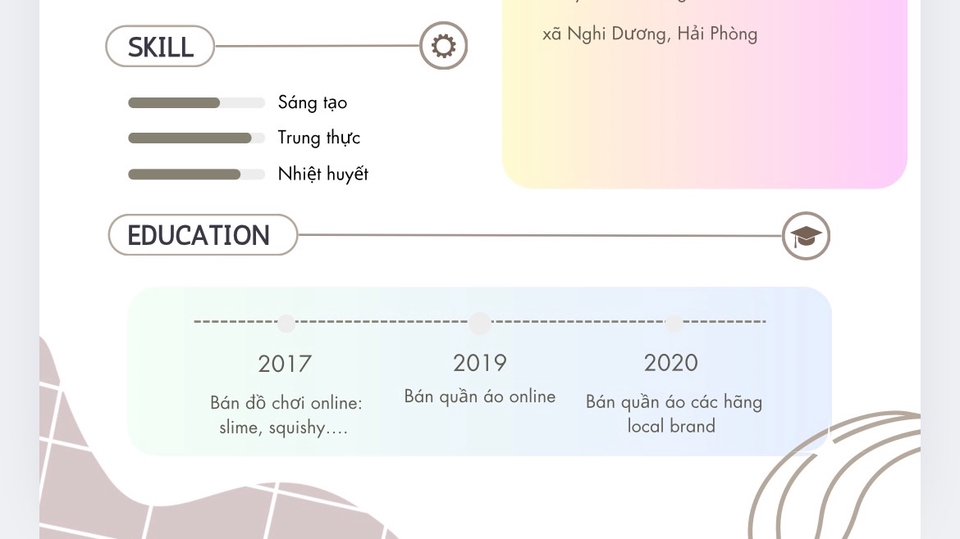 kinh nghiệm bán hàng,edit video, trò chuyện tư vấn khách hàng từ năm lớp 6 và di làm parttime từ năm lớp 9 . Tự tin, trung thực , sáng tạo !